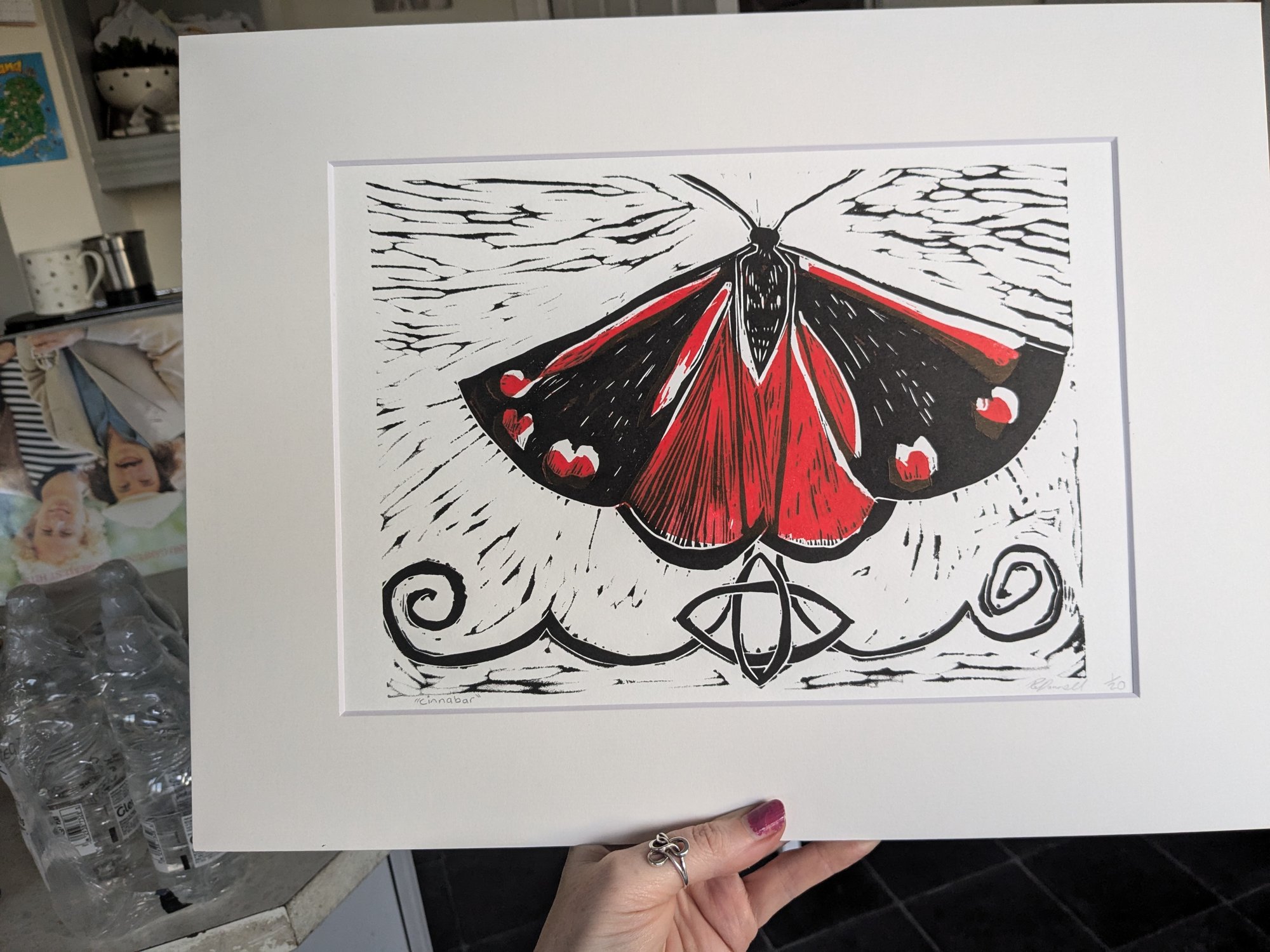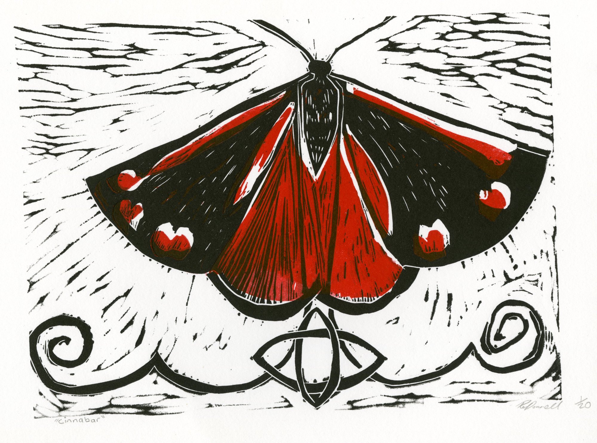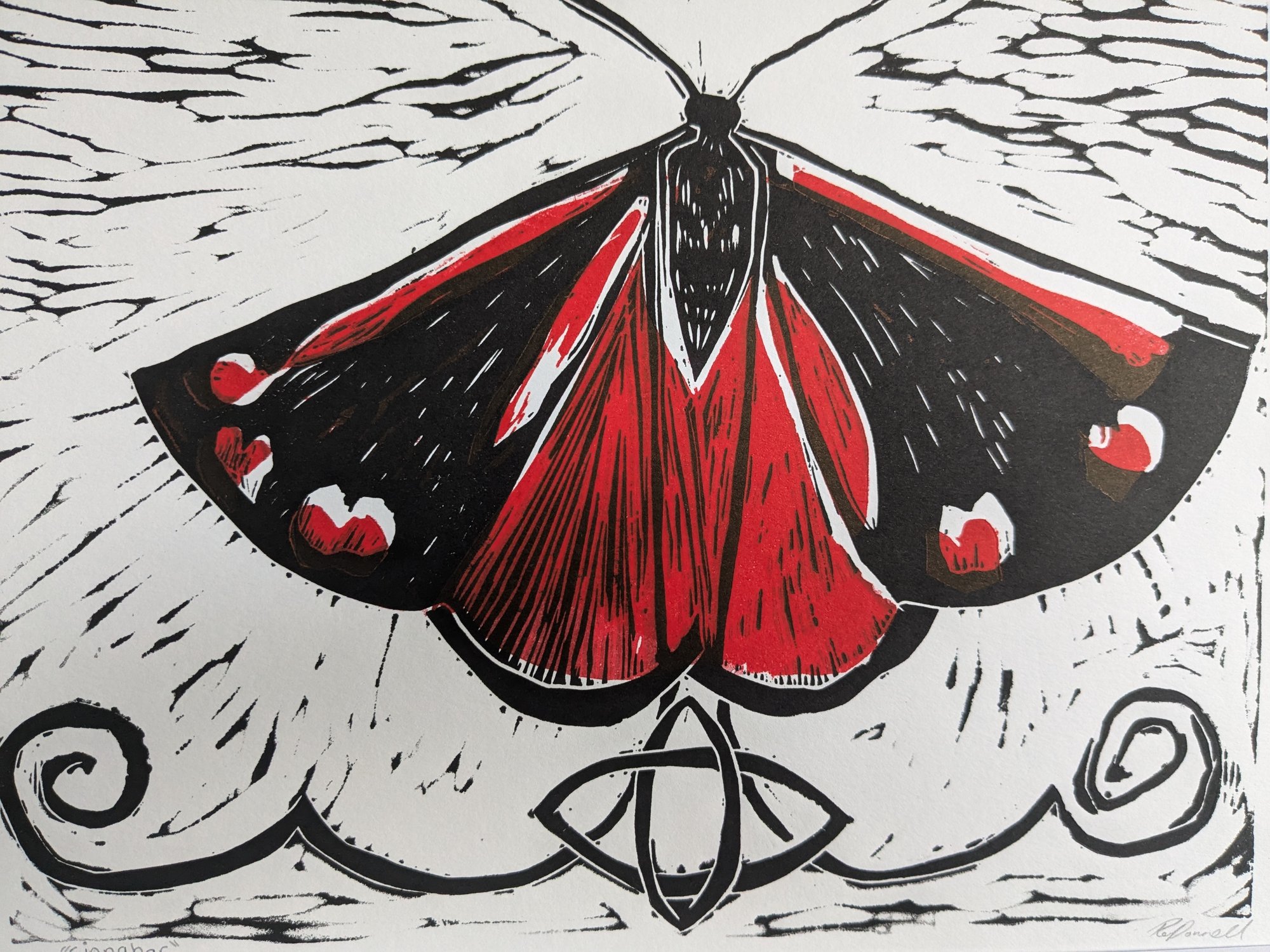 A lino print of the cinnabar Moth,