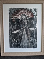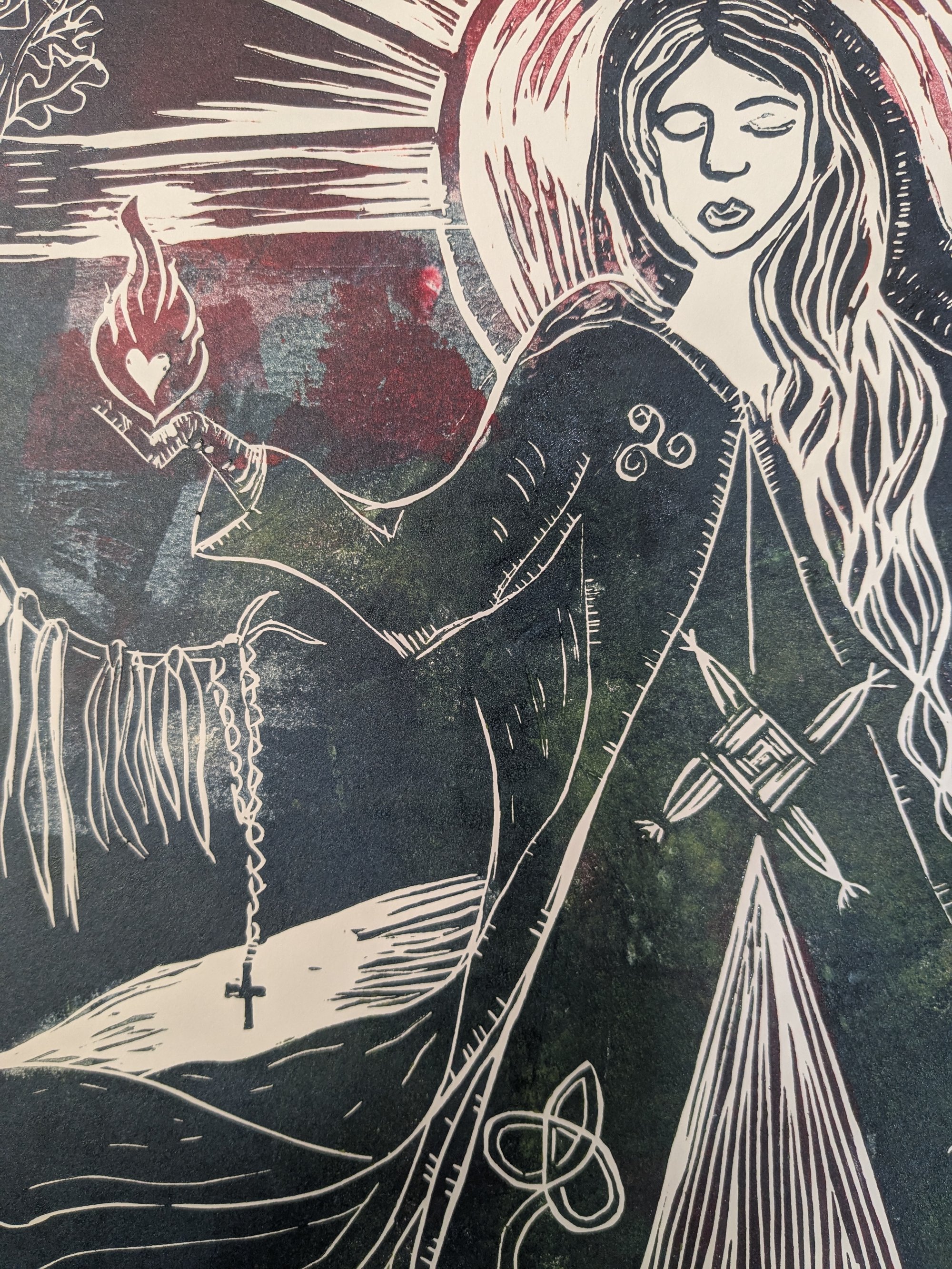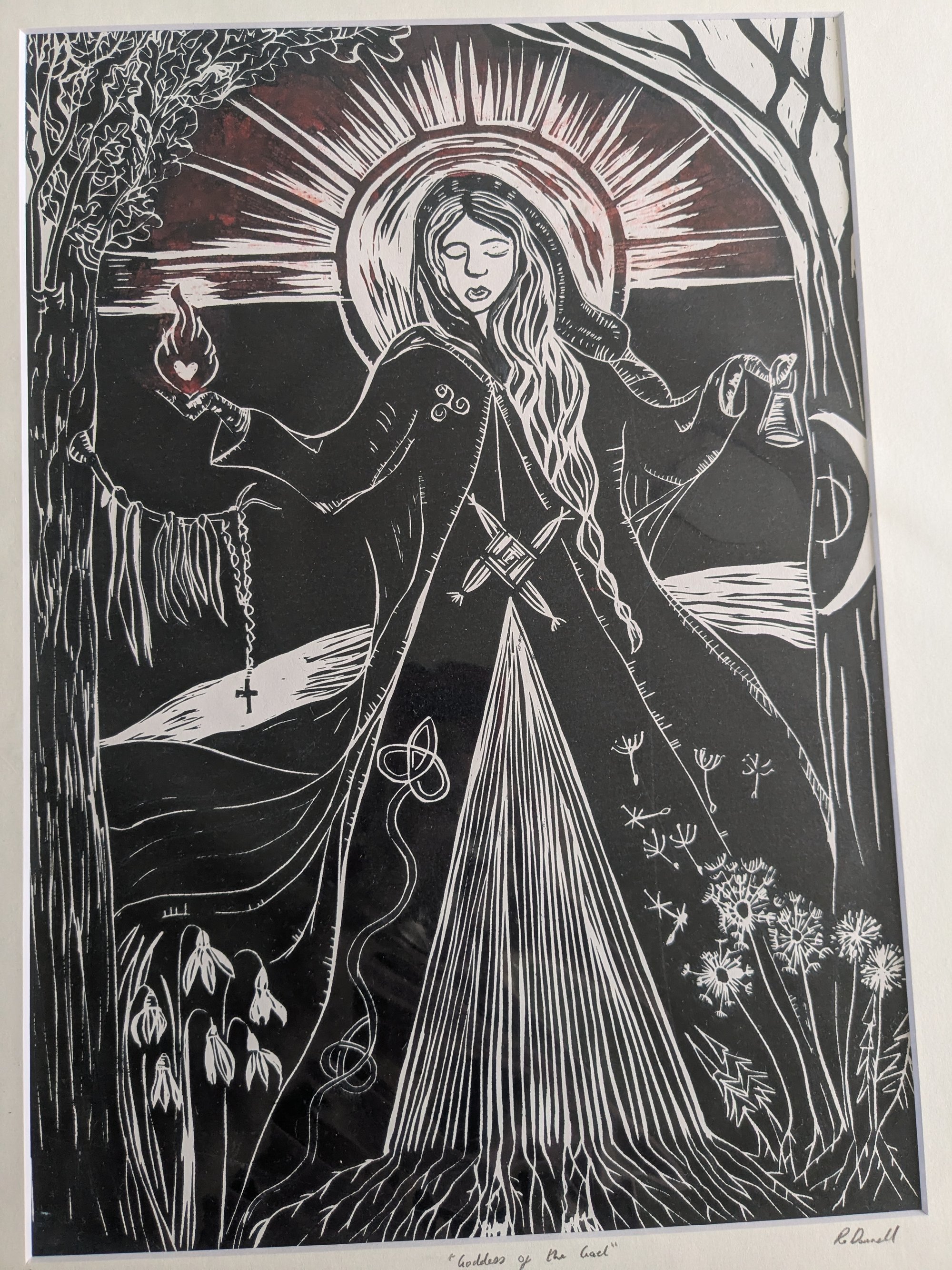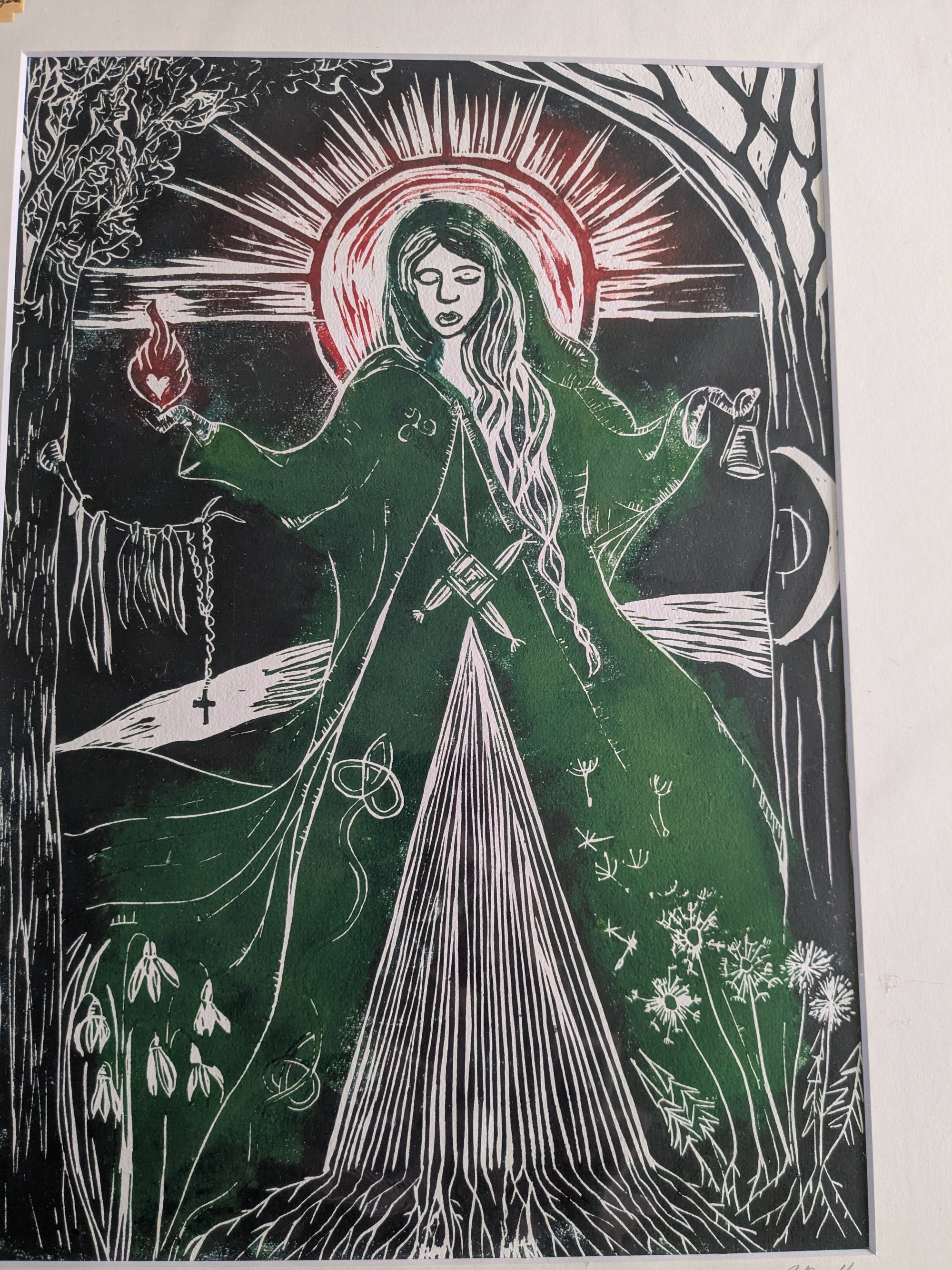 the print depicts the symbols of Brigid, her cloak, the triskele, snowdrops, dandelions, the oak tree, the crescent moon, her eternal flame, it also shows the offerings that people leave out for her on the 31st of January before the dawn of Imbolc.