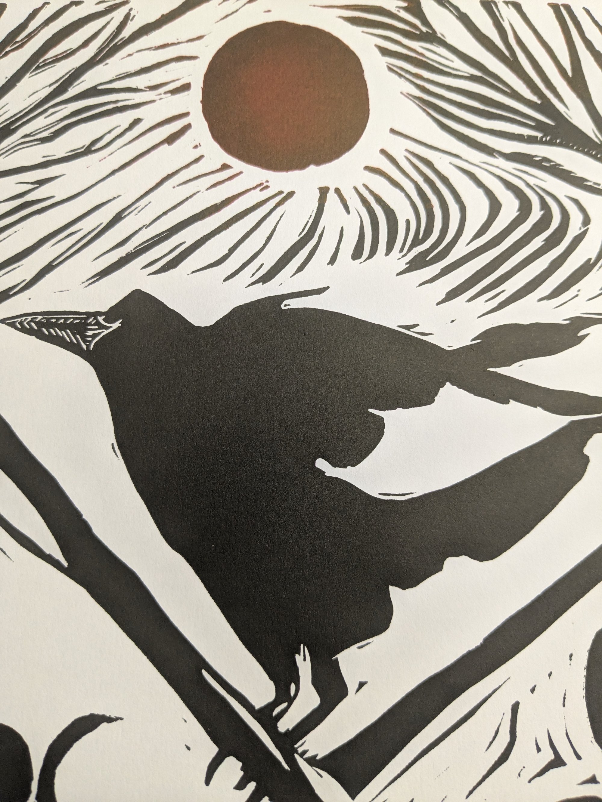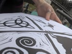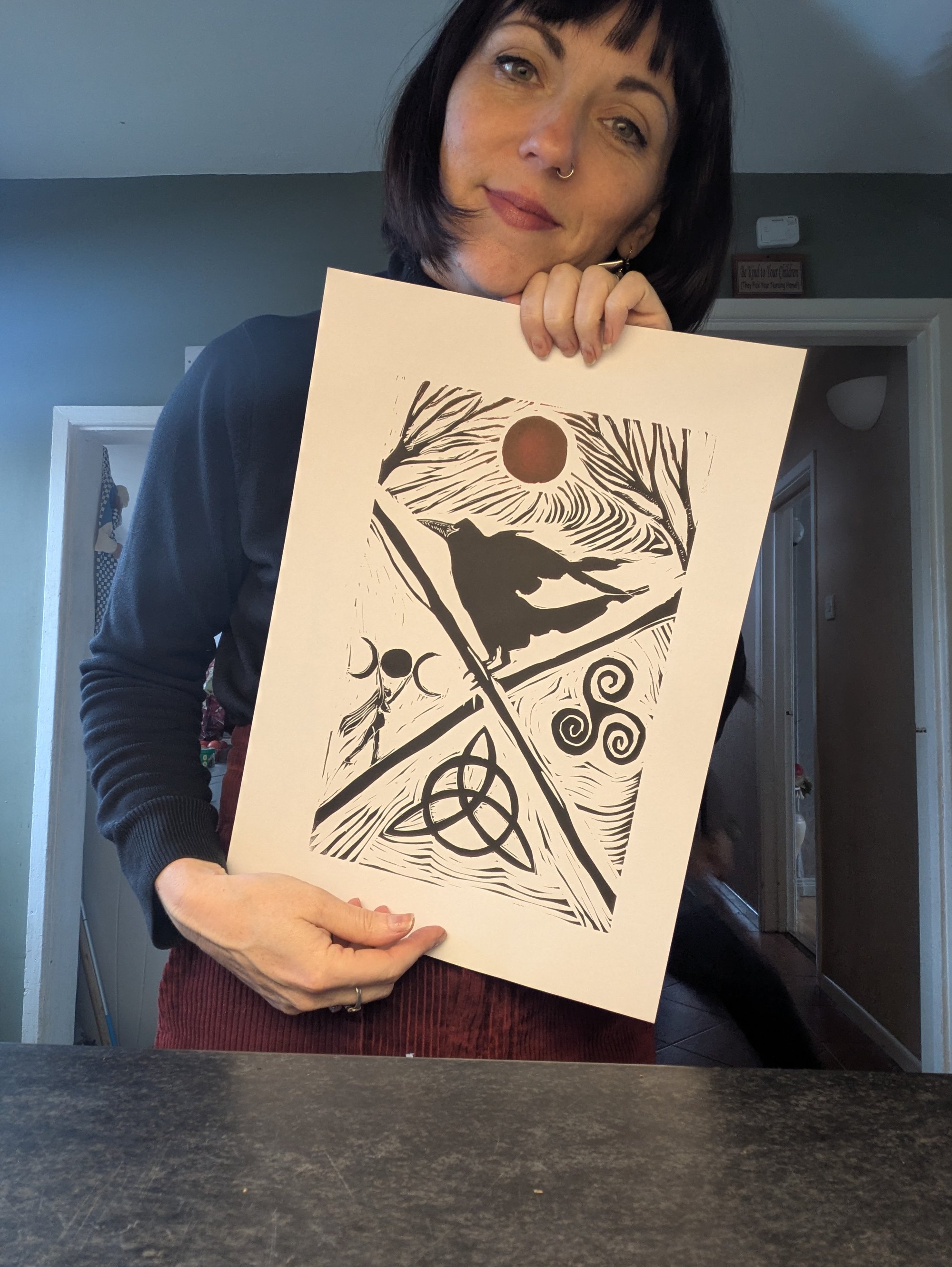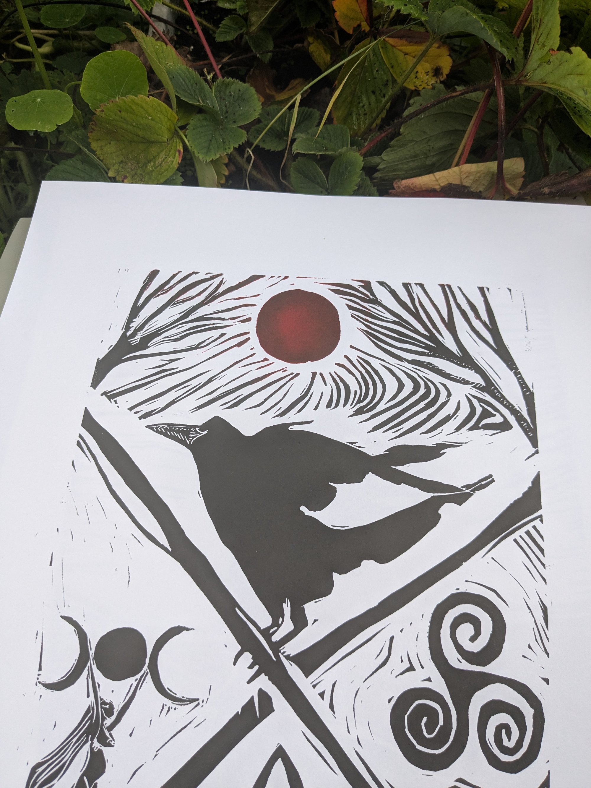 This linoprint depicts the goddess Macha, is a triple goddess,The morrigan and badb She is also associated with the color red