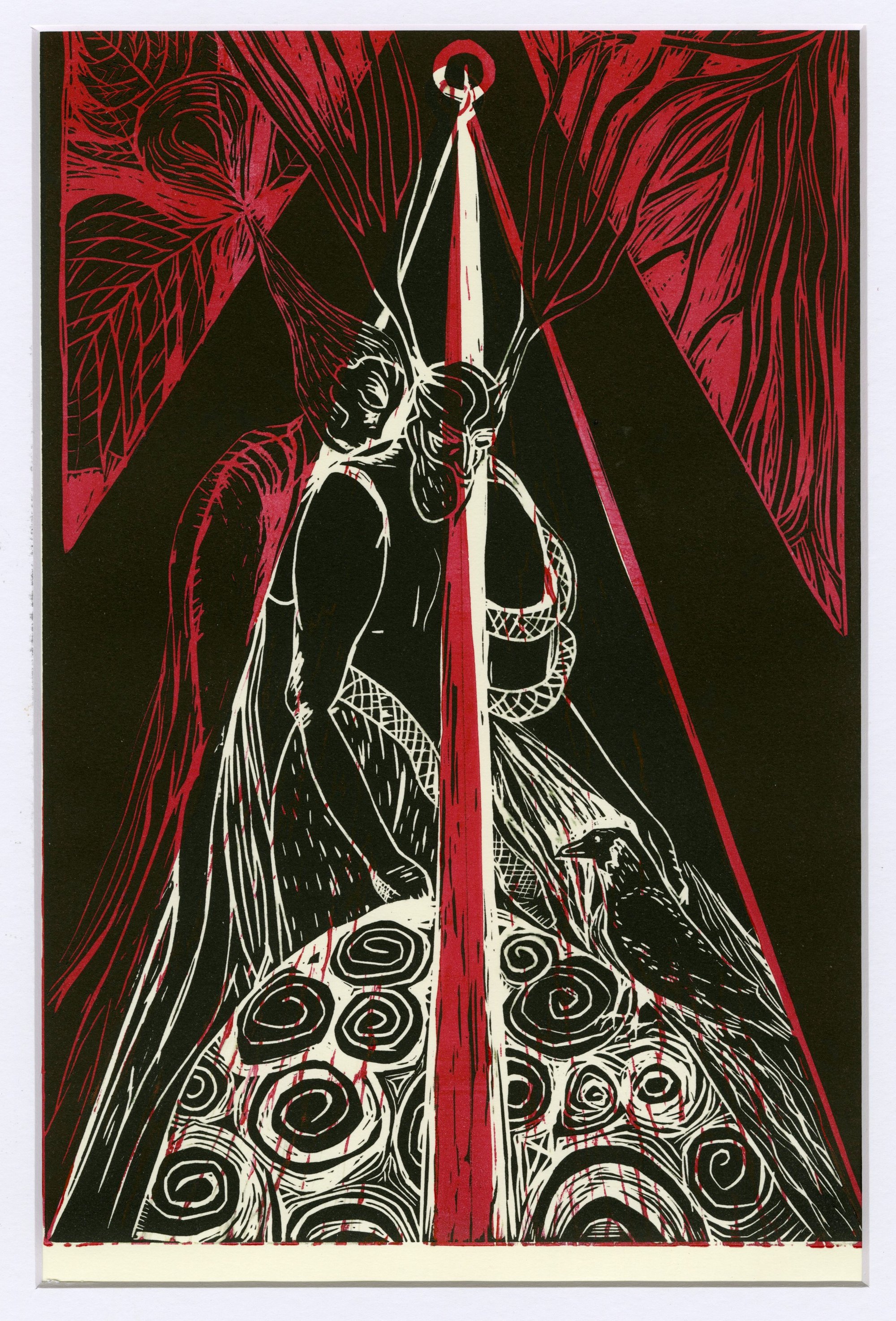 Linoprint In red and black of the veil between the two worlds mentioned in Irish folklore and mythology, we have two gate keepers male and female, part of the Tuatha Dé Danann, the crow also a gate keeper of who chooses who gets to go through and who stays in the Veil. This is a one off proof print.